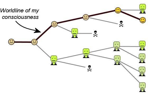3. Isso poderia continuar indefinidamente, implicando uma forma de imortalidade - desde que haja algum ramo em que você sobreviva, sua consciência continua a experimentar esse ramo. Isso é a "imortalidade quântica".